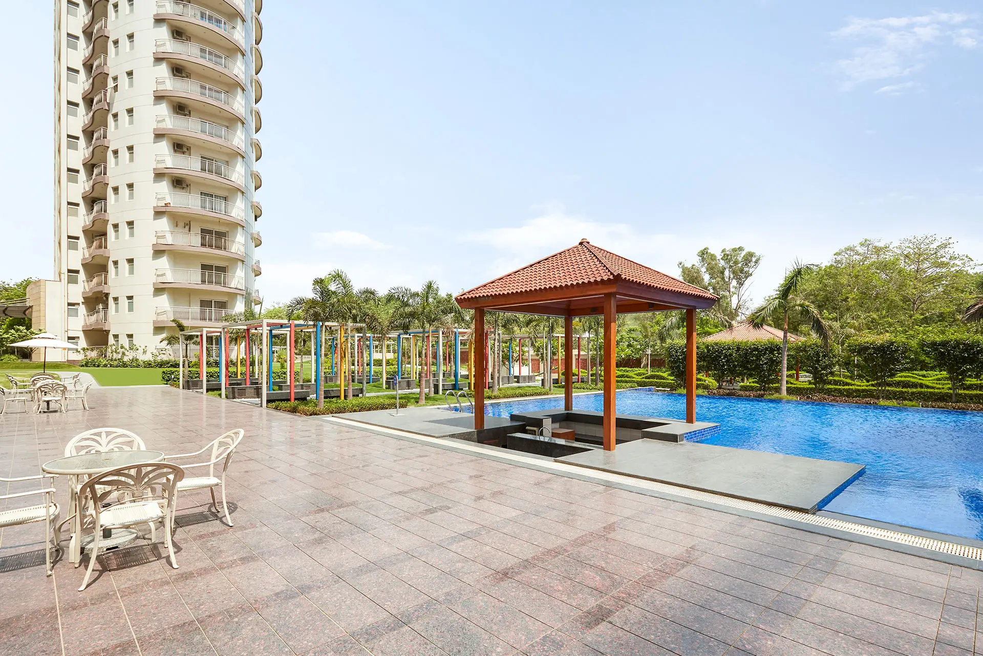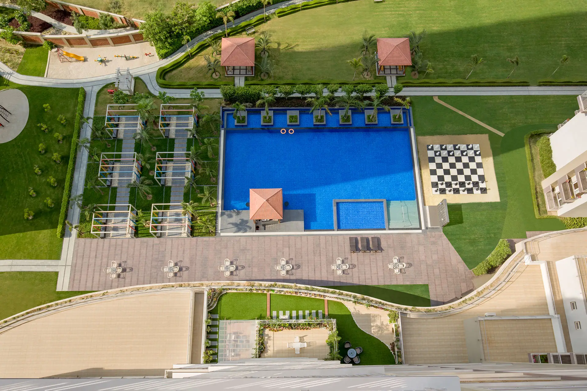 - A premium clubhouse spread over 40 thousand Sq. ft area which includes 2 Swimming Pools for adults & kids, gym, steam, sauna, card room, squash court, indoor badminton court, Private hall, Multi-cuisine restaurant, bar & many more.